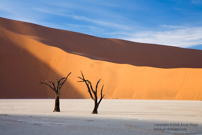It is a great descent down the steep dune face to the pan. The dead flat surface, the result entirely of water deposition, is hard and easy walking through the trees looking up to the massive dunes. Magical.