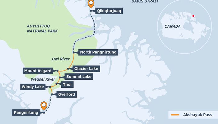 AKSHAYUK PASS. The main hiking route is a 97-kilometre (60-mile) traditional Inuit travel corridor through the park from coast to coast, following the Weasel River Valley, a glacial valley and unmistakable corridor bordered by sky-scraping mountains. Despite no designated trail to follow, the pass follows significant landmarks. The towering granite peaks of Overlord, Odin, Thor (at 1250m high, it is the second-tallest rock face on earth and overhangs at 105°) and Asgard peaks guide you through this spectacular landscape. This route requires about eight days (one-way). Extra time should be allotted in case of bad weather and river crossings that can affect your schedule at any time in the season.