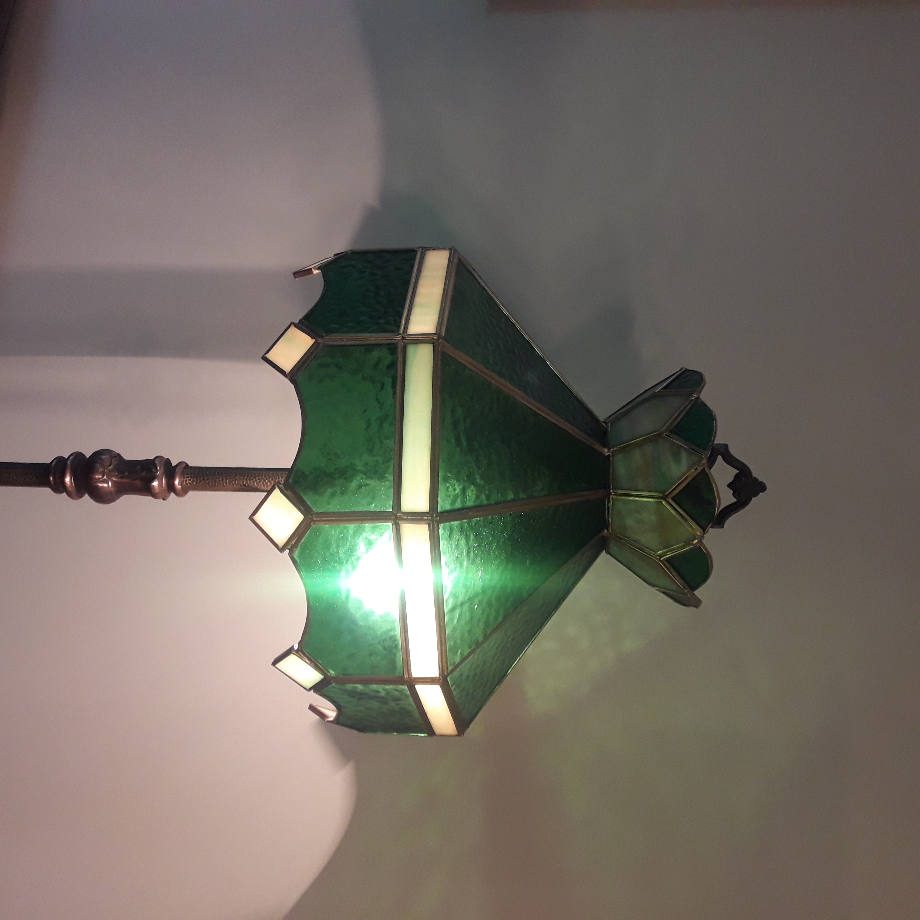 2. Metal standing lamp. Unique copper-plated iron stand. Mexican stained glass shade.