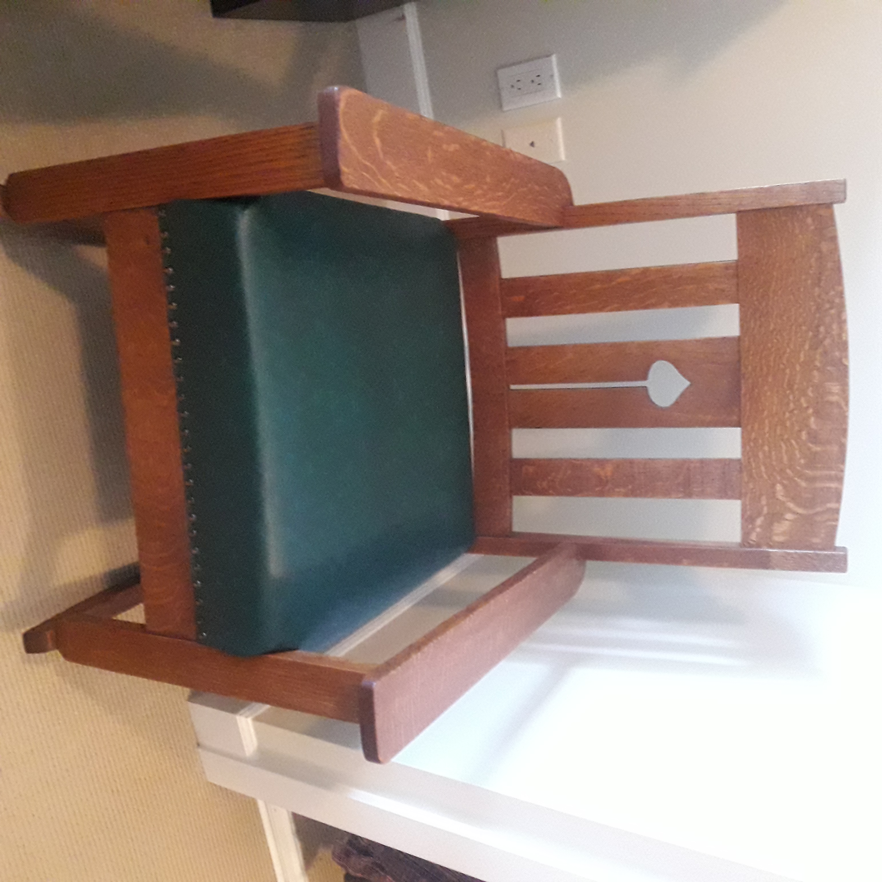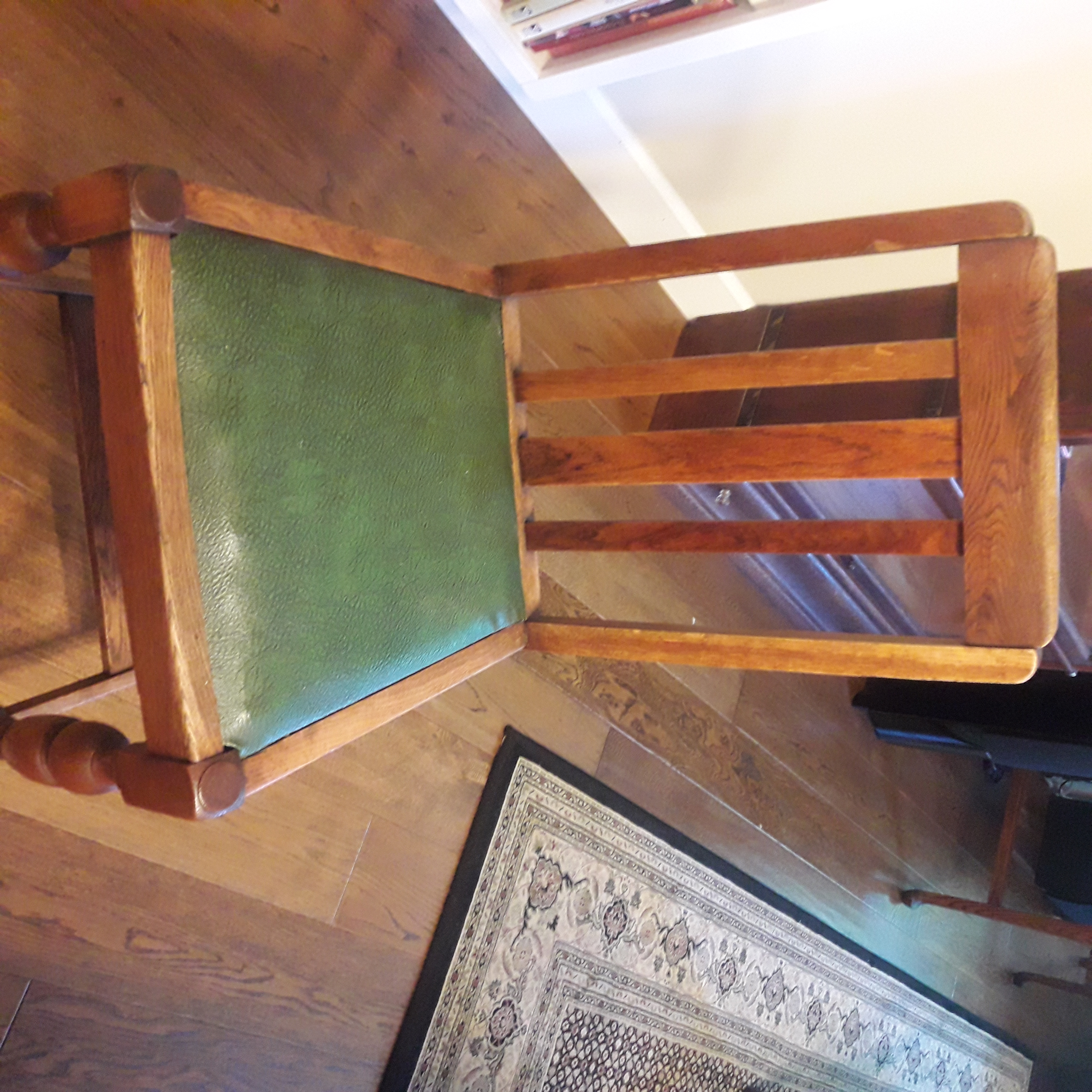 19. Dining room chairs. Not quarter-sawn. Green leather seats original. Howard Restore. One of the pieces I would like to improve with quarter-sawn pieces.