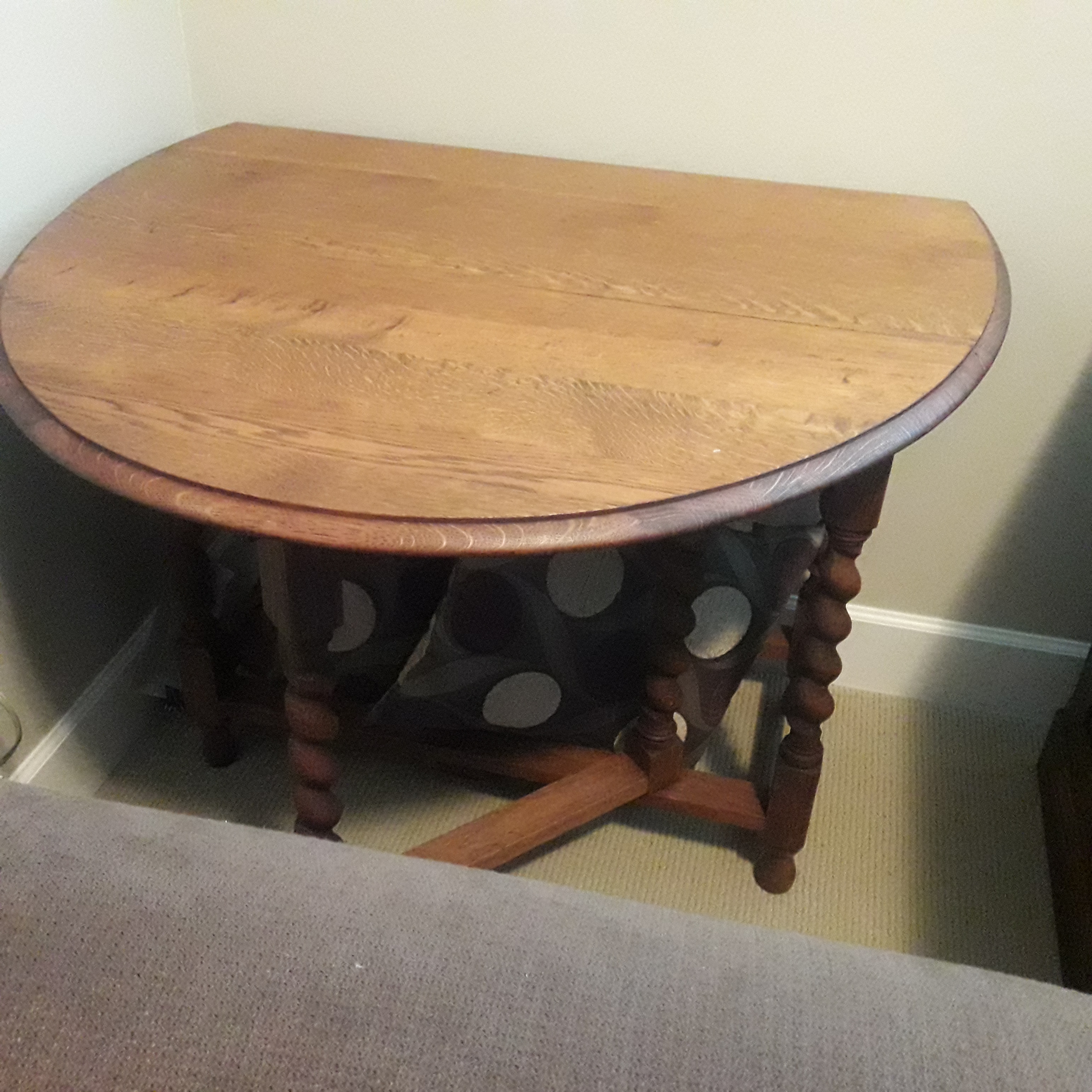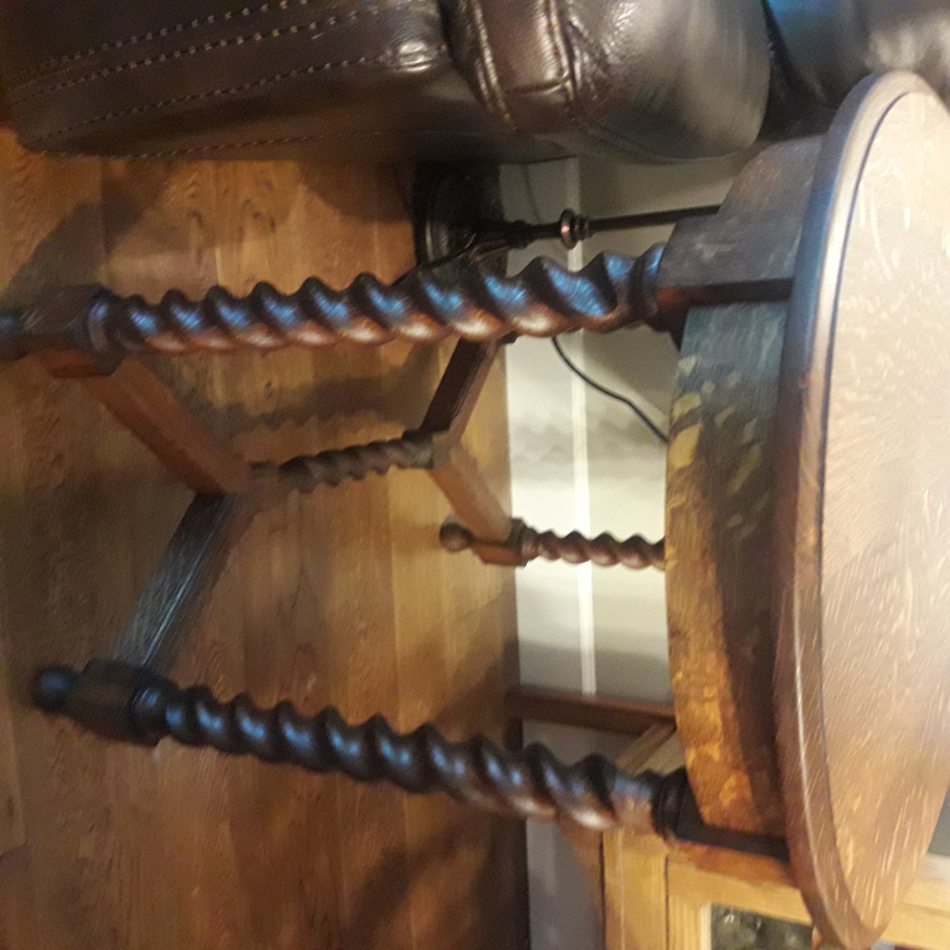 18. Drop Leaf table. 47.5″ x 36″ x 27.5″ high oval drop leaf table that folds down to 16 x 36 inches. Mediocre grain. Barley twist legs. This is a great work table that is easy to move around and has three sizes. ![]()