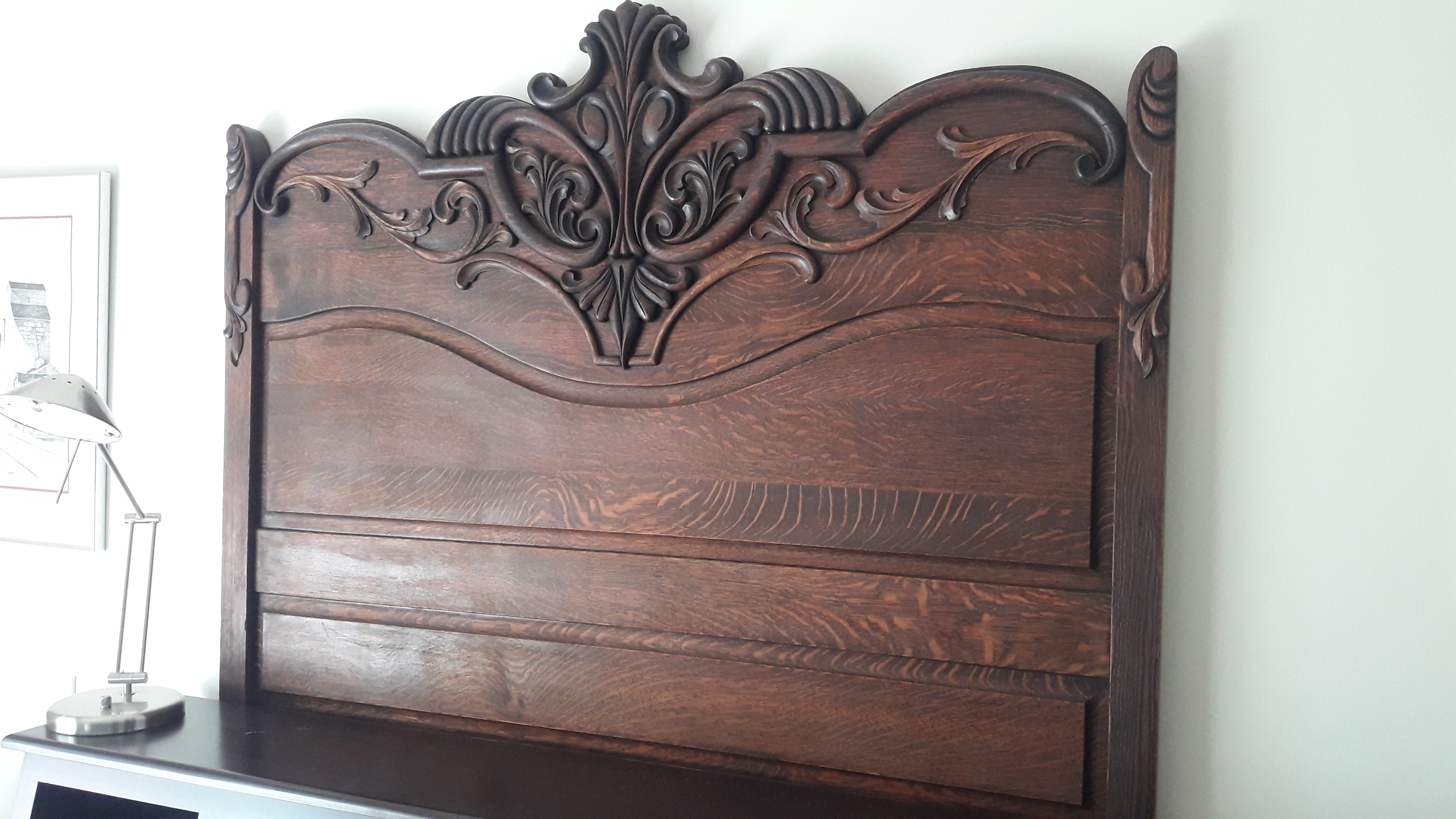 7. Double bed headboard. 56″ wide x 77″ high. Spectacular grain. Opulently carved top. Finished with Howard Restore. World-class.