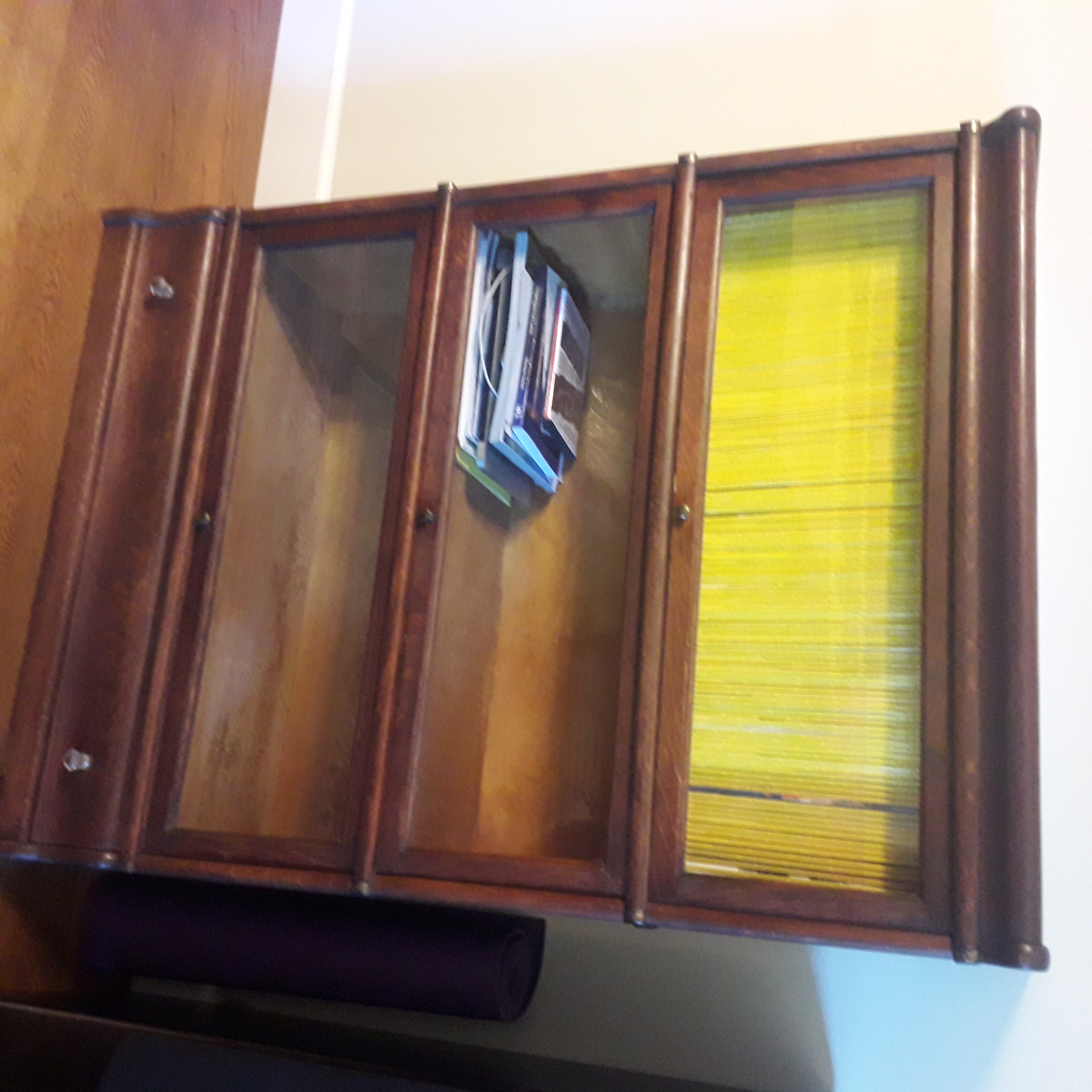 5. Barrister’s bookcase. Globe Wernicke Co “Elastic” Book Cadet, 3-stack. Grade D299 (tiger oak with medium finish). Patent 1896, 1987, 1898. The original company label is from Cinncinati, Ohio (Branches and Agencies Everywhere) but the stamp says Stratford Canada. 34″ x 12″ x 46.75″ tall. 5-piece (top, 3 shelves, bottom with drawer), glass doors. Original finish. Wavy glass. Possibly my most valuable piece of furniture dollar-wise.