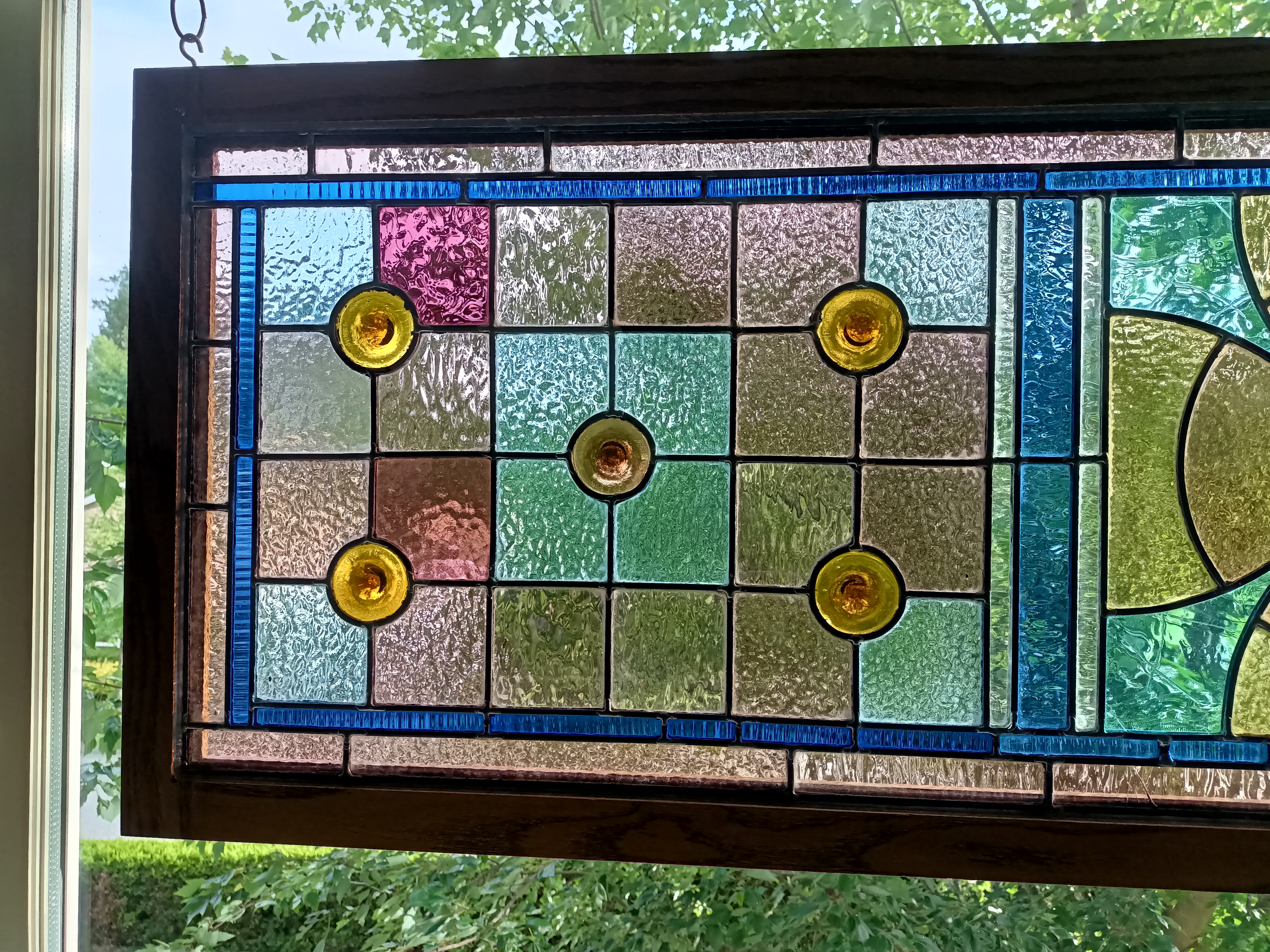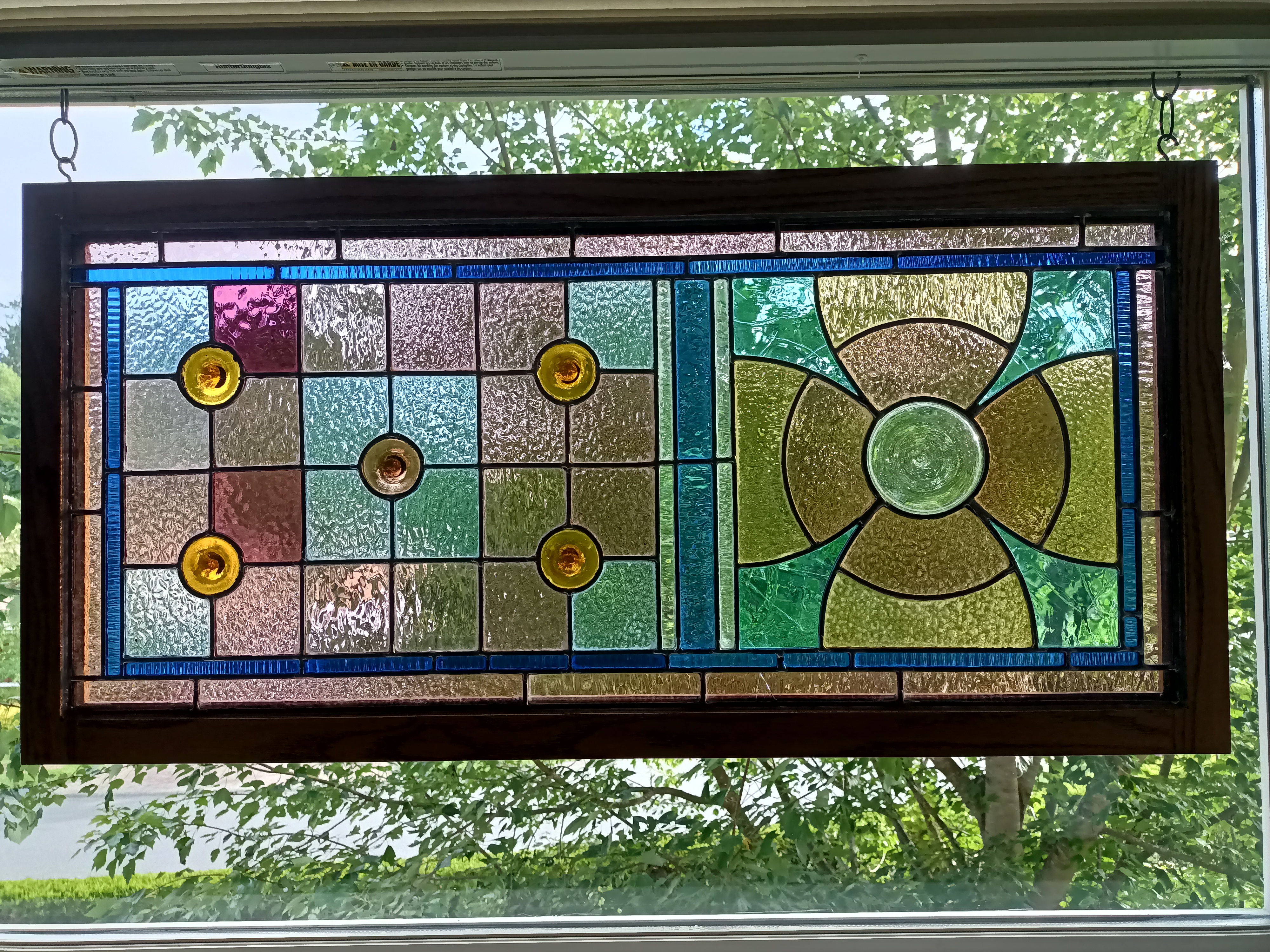 5. Stained Glass Window. This spectacular window was purchased in the Comox Valley from a woman originally from Winnipeg. She purchased the window in the mid-80s at an auction in Winnipeg for less than $100. There was another panel with several broken pieces of glass. She had the window rebuilt – the one panel was removed and the glass was used to repair other broken pieces. All the came was replaced and an oak frame was made. The stained glass company was amazed at the quality of the glass – all handmade – and probably dating from the 1890s. The round “bubble glass” pieces are quite rare. This is the result and explains all the asymmetry in the window. She had done some research but was unable to find any history on the window.