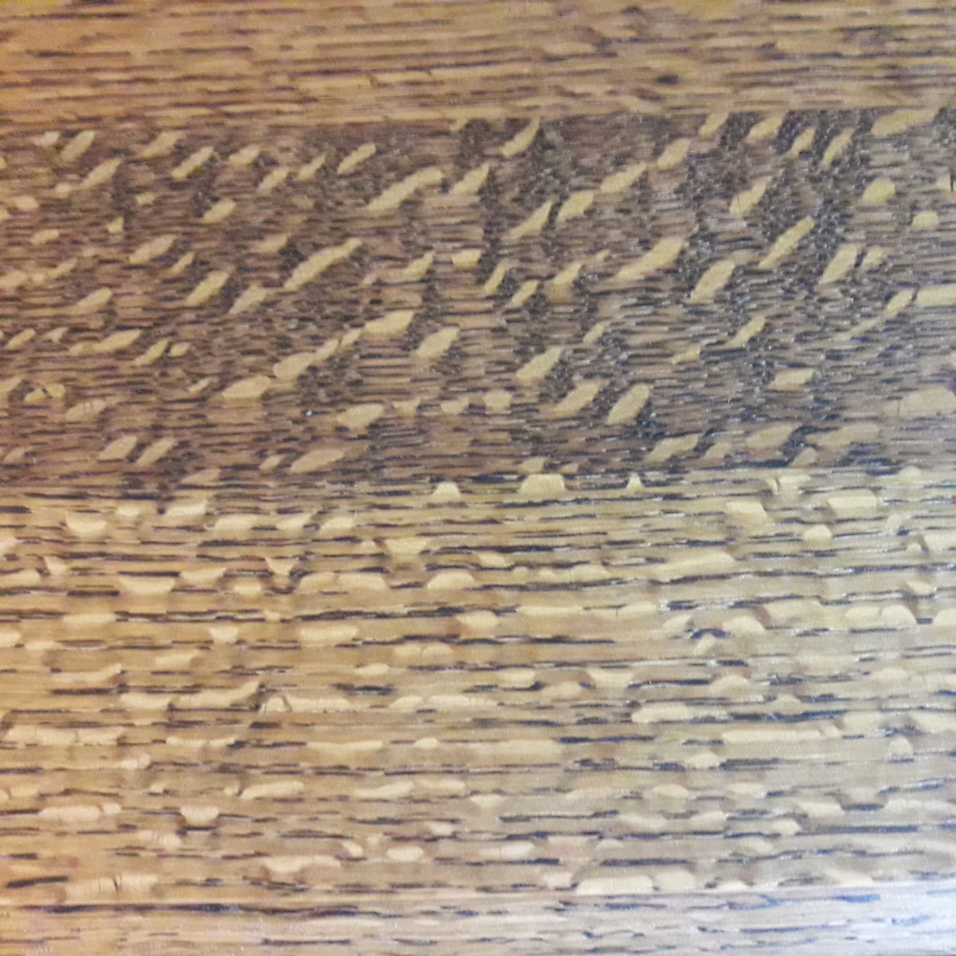 In flat-sawing, the log is passed through the blade cutting off plank after plank without changing the orientation of the blade or log. The resulting planks have different annual ring orientations when viewed from the end. The relative angle that forms the rings and the surface goes from almost zero degrees in the external planks to almost ninety degrees at the core of the log. Especially in oak, the grain displayed is the distinct “cathedral window” or flame grain. It is also more prone to cupping. Wood tends to cup in the direction opposite the bend of the growth rings. Due to the angle at which it’s cut, flat-sawn oak will almost certainly begin to warp over time as the growth rings are set at such a low angle to the face of the board.