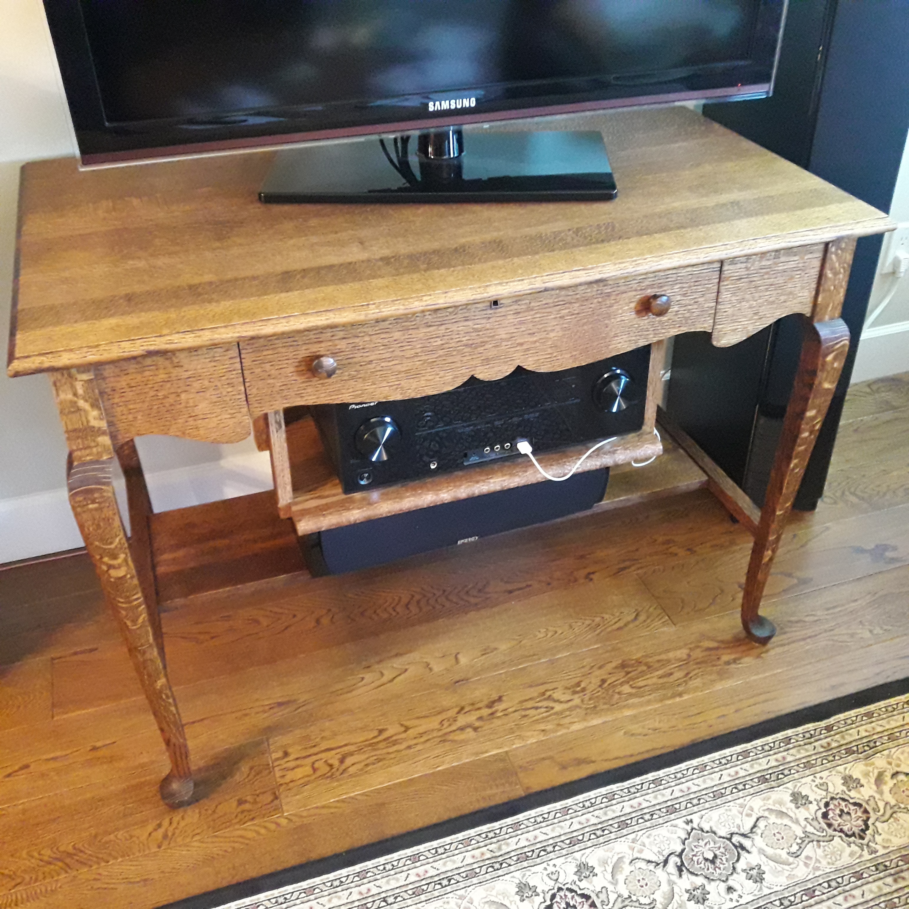 I had the shelf for the ampifier made from an old leaf from my large round coffee table. The only “damage” to the original piece are screws into the drawer hanger.