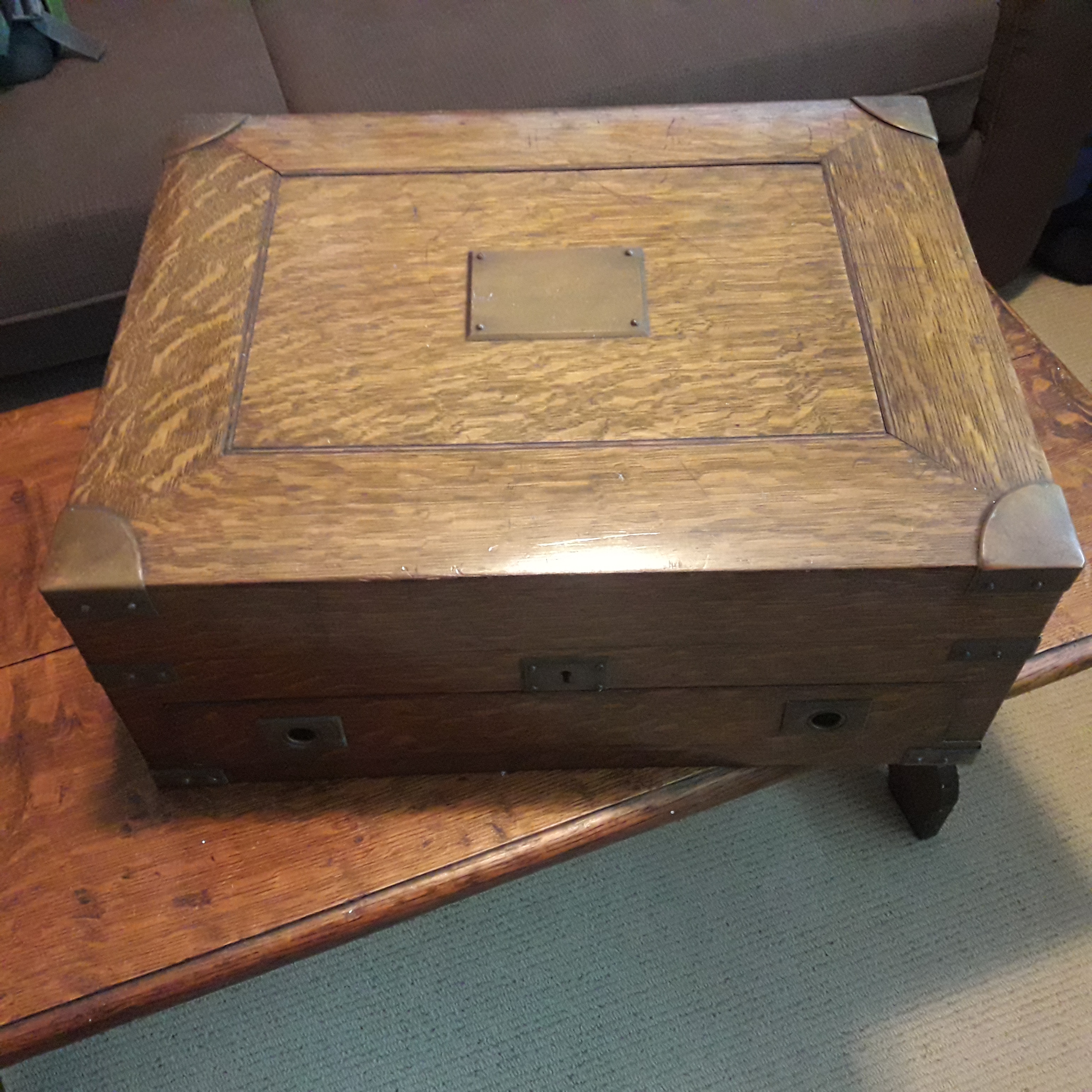 23. Whiting Silverware box. 18.5″ x 14.5″ x 8″ high. Drawer front but no drawer. Spectacular grain with brass corner braces, plaque and drawer pulls.![]()