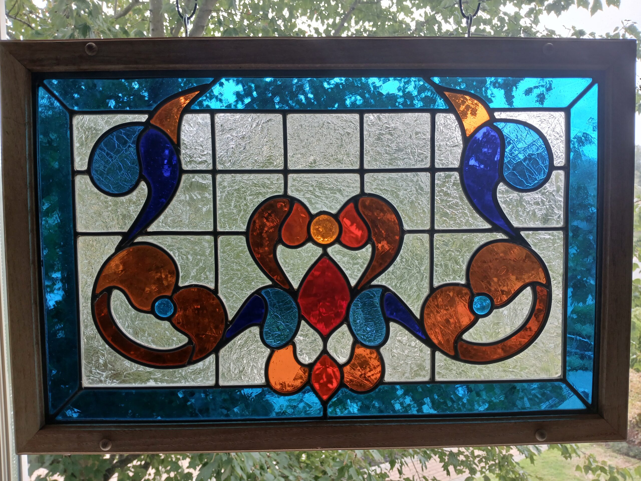 I have been looking for a small window for some time to cover my third window looking down to the condominiums. I found this in a second hand store in Yuma, Arizona. Nobody had recognized that it was not a picture in a frame. It had been marked down from $36 to $7. A great bargain. It is a “clunky style” but I love how the sun shines through the blue in the late afternoon.