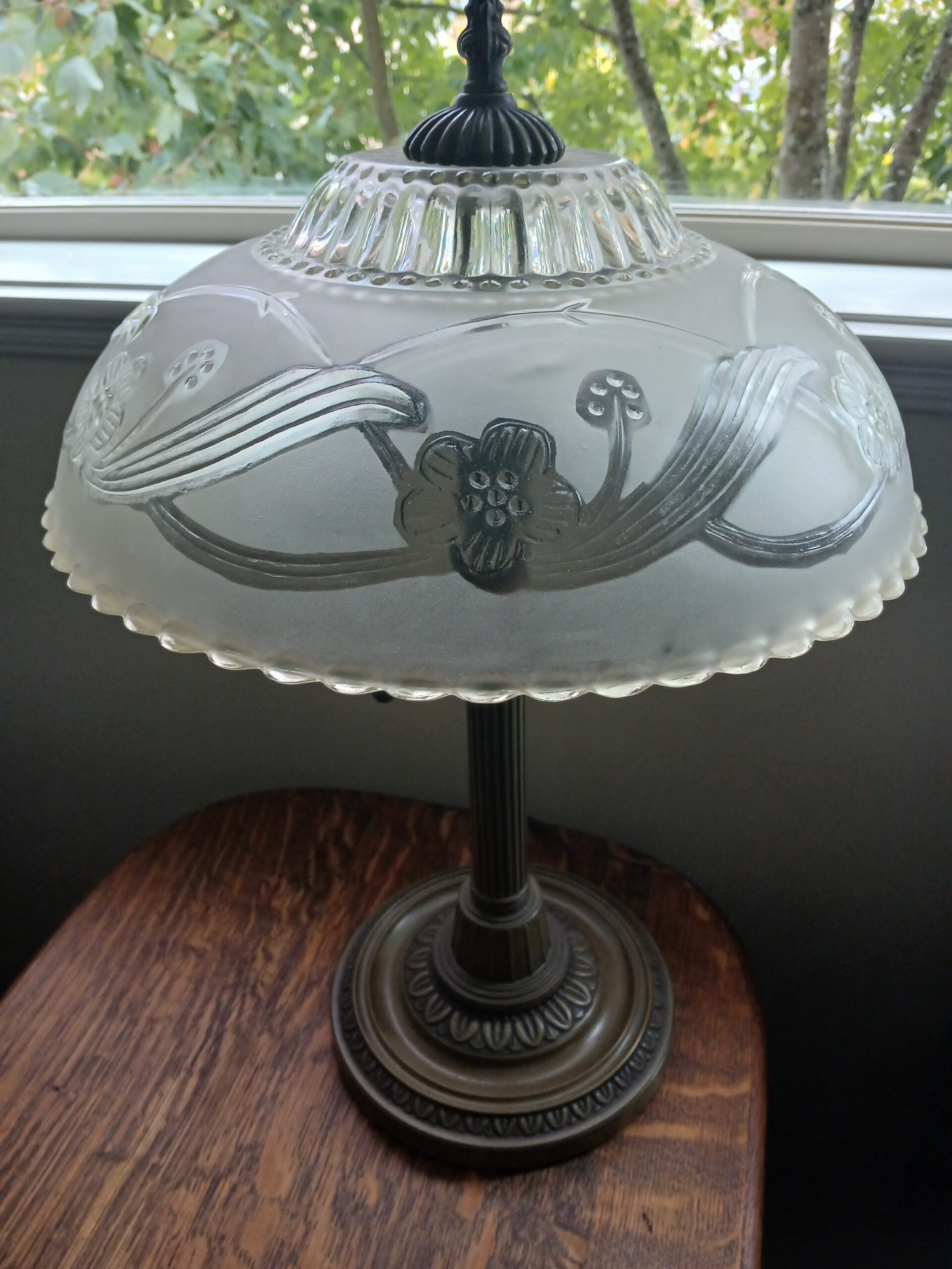 1. Table lamp. Unique clear, cut-glass shade, repurposed base.