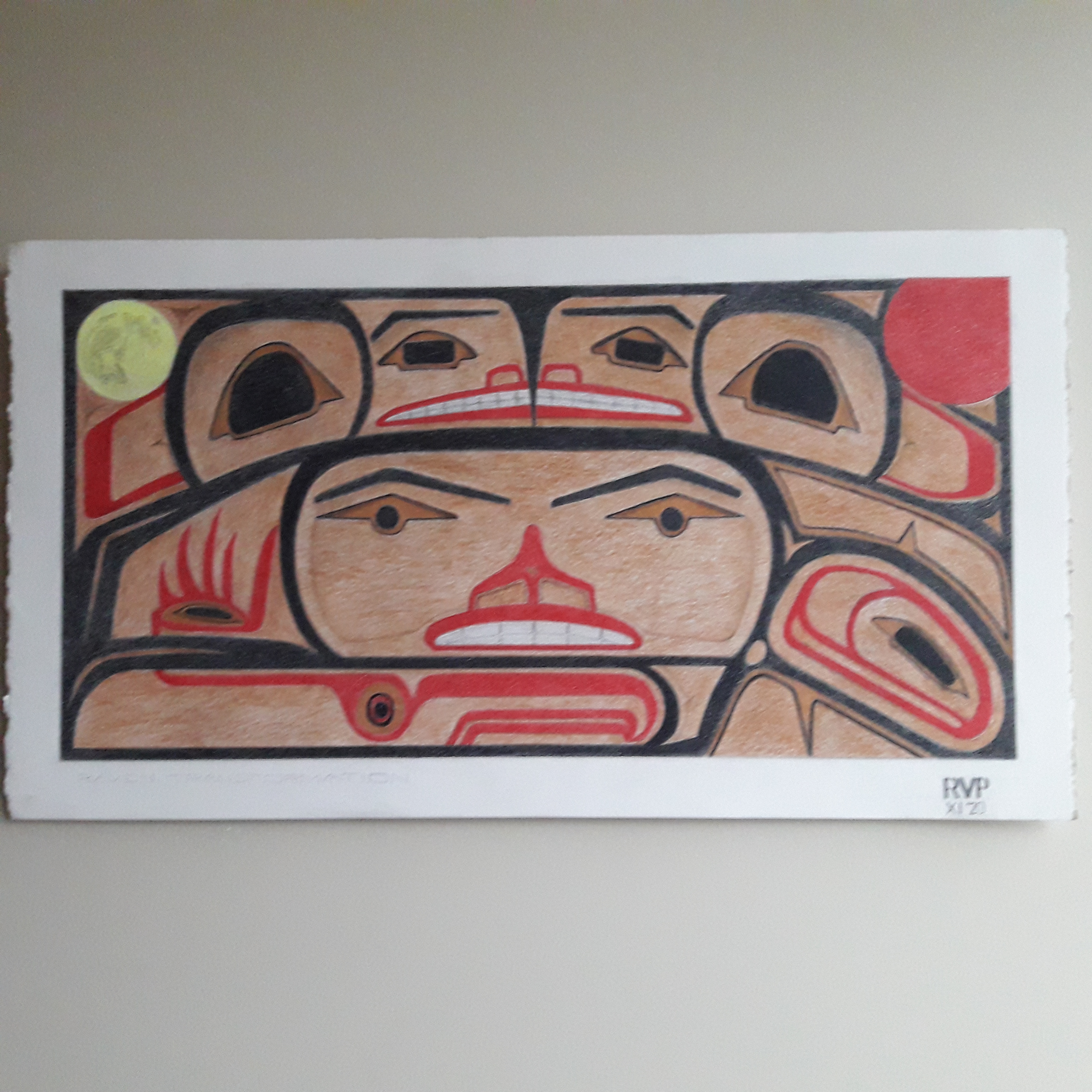Adding the sun is not common and a moon is not normally in NW coast images. My interpretation is an egg (bottom right), chick (bottom left), child (centre) and teen (top). Raven images flank the sides. I am tempted to complete the circle of the sun outside the “frame”.