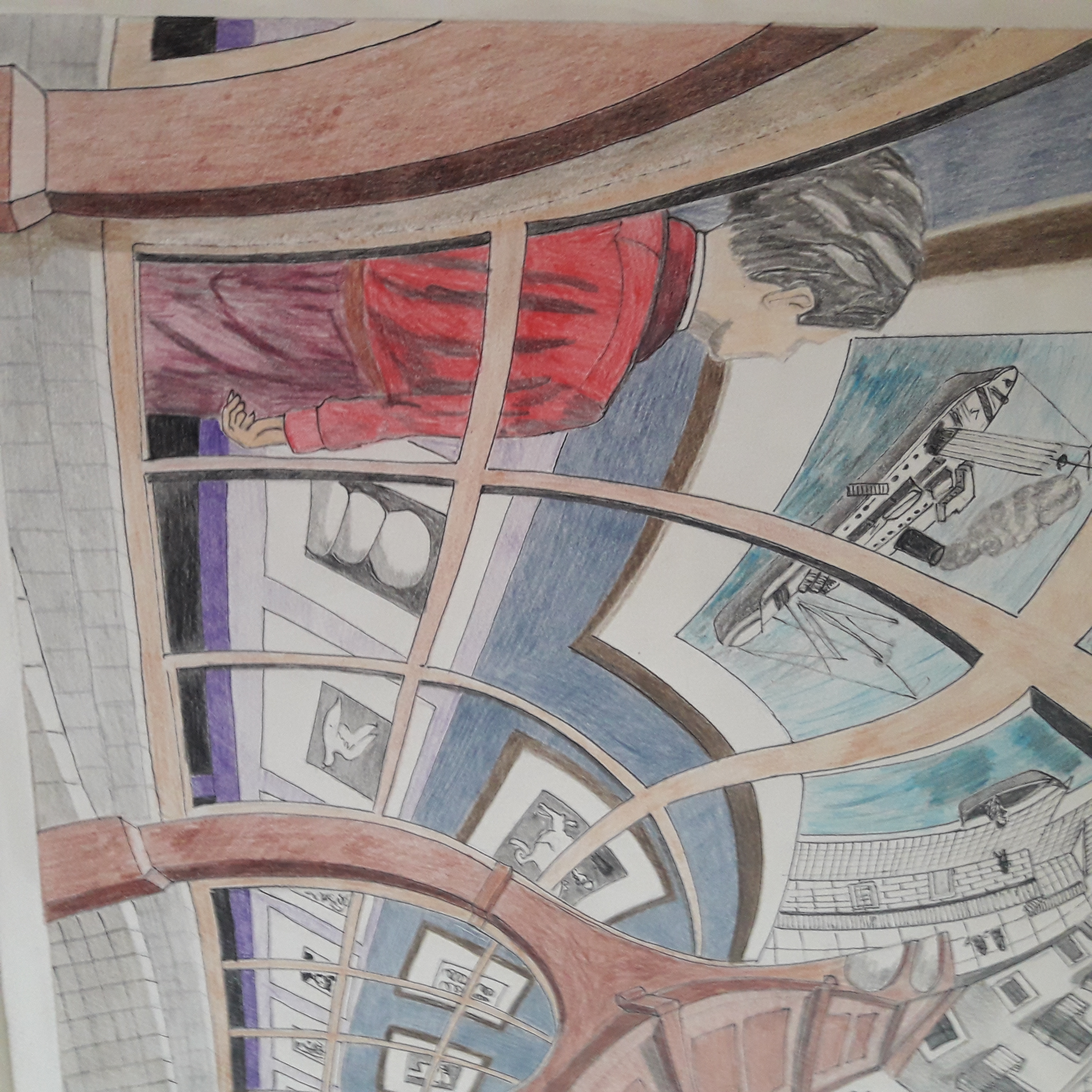 As a variation on the theme of the magnification towards the centre (see “Doric Columns”), this is an expansion that curves around the empty centre in a clockwise direction. We come in through a door on the lower right to an exhibition gallery where there are prints on stands and walls. First of all, we pass a visitor with his hands behind his back, and then, in the lower left-hand corner, a young man who is already looking at the last print in a series on the wall and glancing at the details, the boat, the water and the houses in the background. Then his eye moves further on from left to right, to the ever-expanding blocks of houses. A woman looks down through her open window onto the sloping roof which covers the exhibition gallery, and this brings us back to where we started our circuit. The boy sees all these things in two-dimensional details of the print that he is studying. If his eye explores the surface further, then he sees himself as part of the print. MCE