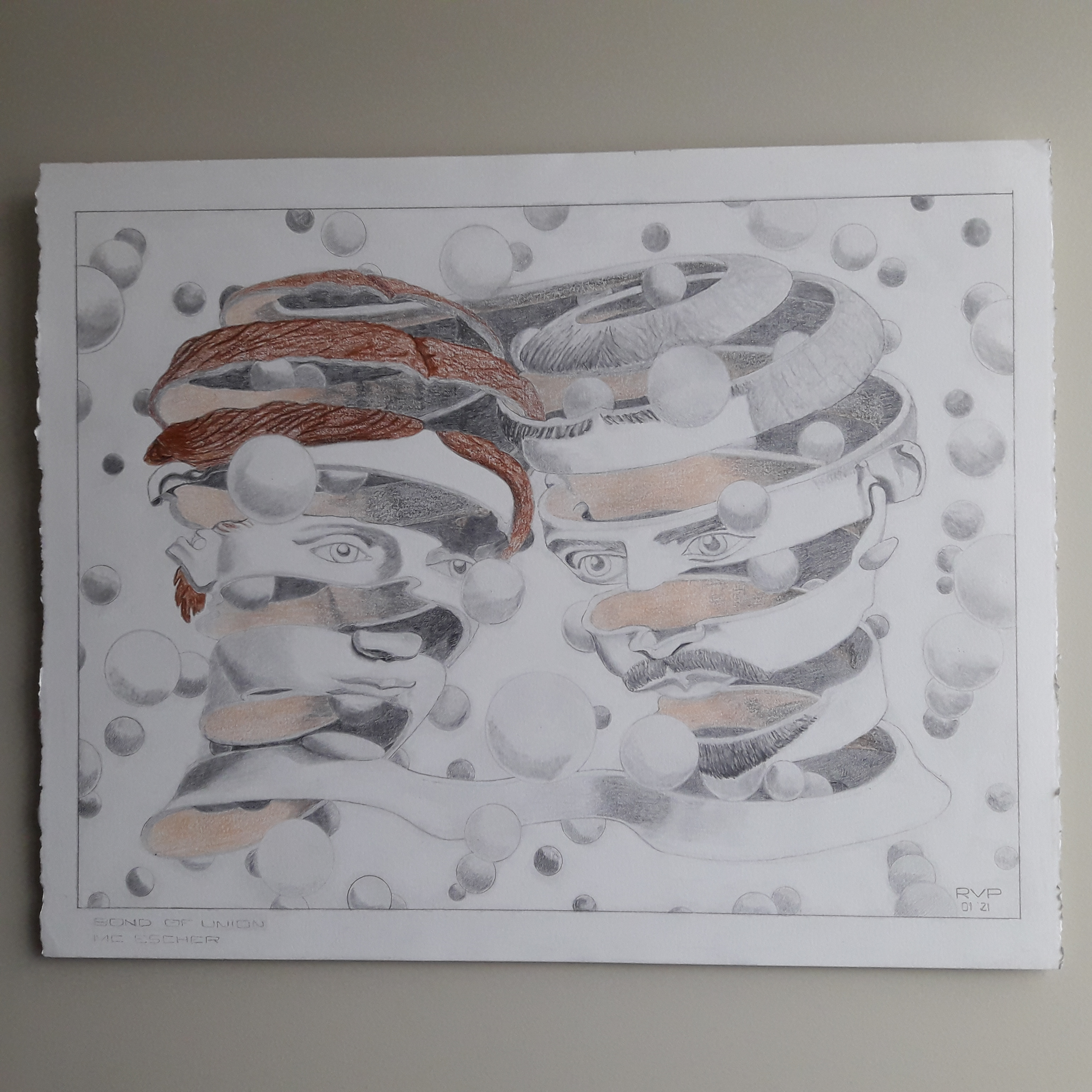 Two spirals merge and portray, on the left, the head of a woman and, on the right, that of a man. As an endless band, their foreheads intertwined, they form a double unity. The suggestion of space is magnified by spheres which float in front of,d within and behind the hollow images.