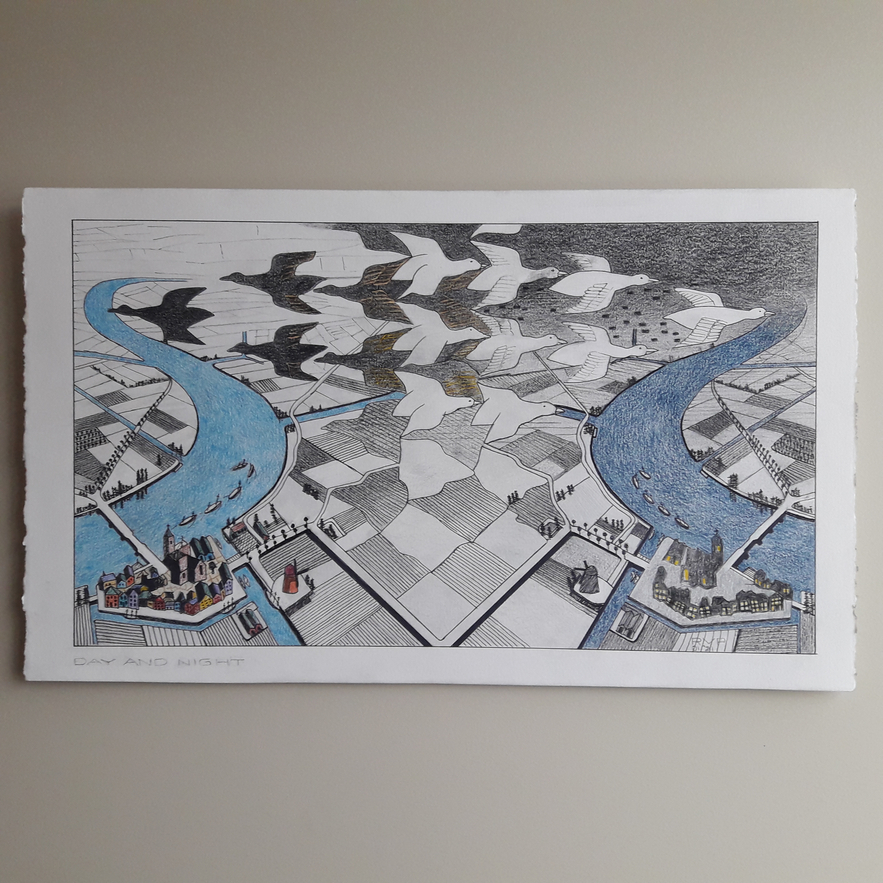 Another M. C. Escher print. This was not very interesting and quite tedious, a lot of drawing, redrawing and then outlining in black ink. I did not learn much with this picture.