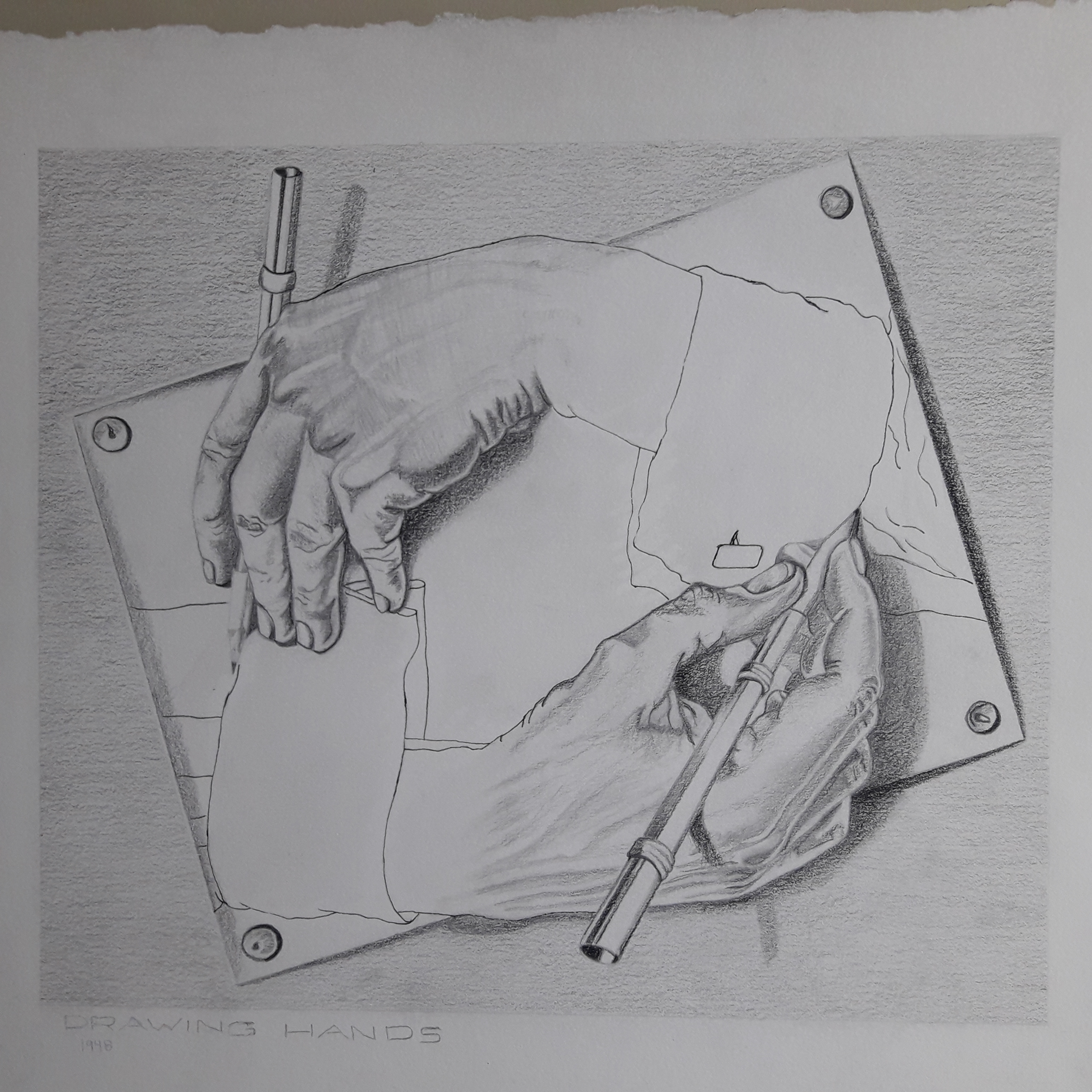 I apologize for being completely unoriginal – I’m a plagiarist. I really know little about drawing and art and doubt that I would ever create much original art. But I have visited hundreds of art museums (1452 to be exact) in my travels. I have seen the world’s best. I like bits of most kinds of art but really only enjoy realism. My favourite artist used to be Dali but has more recently been replaced by M C Escher. His are the pictures I have been drawing.
