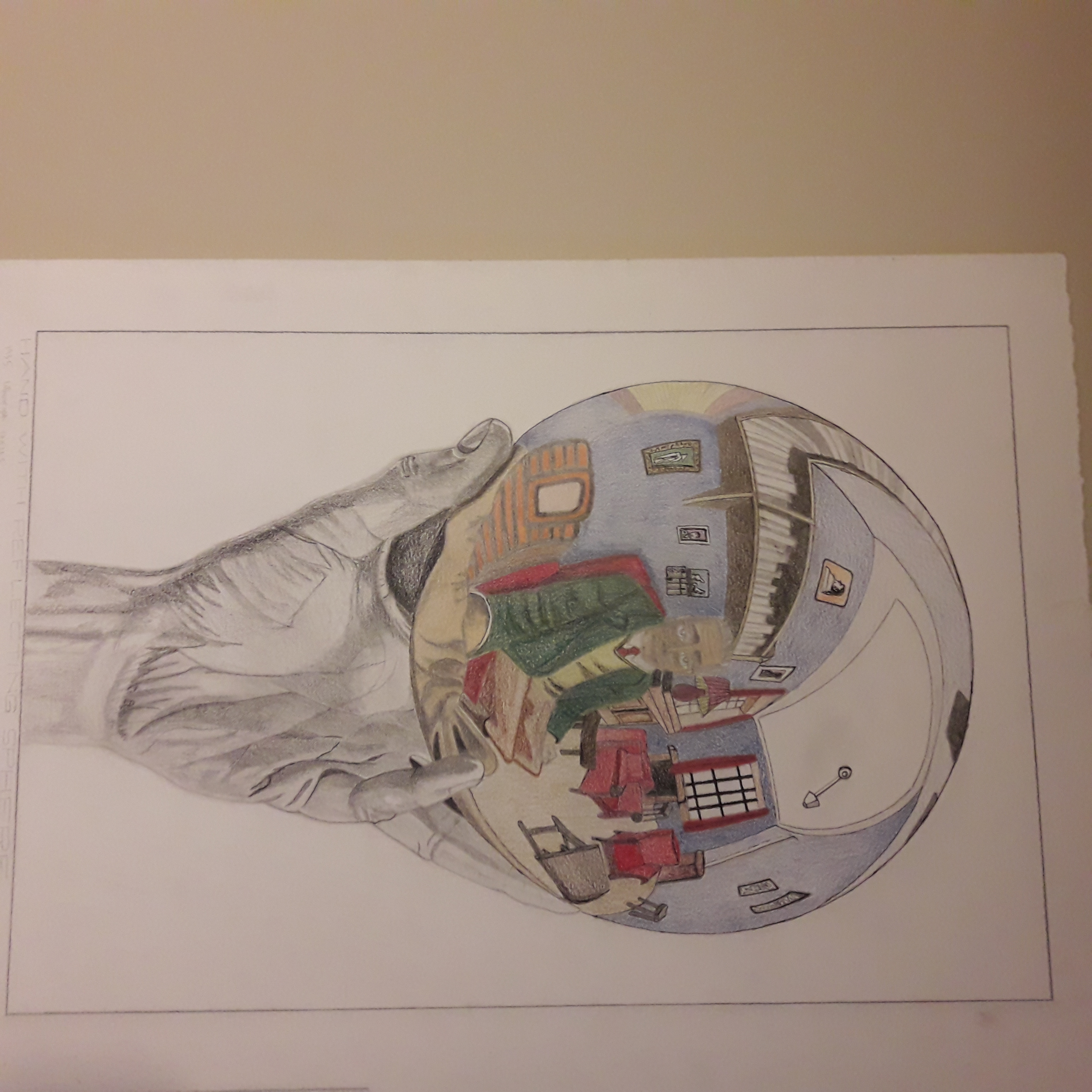 In the lithograph Hand with Reflecting Sphere of 1935, Escher is holding the sphere in his hand (which is itself reflected) so that he also has himself and his studio “in hand”. Bruno Ernst