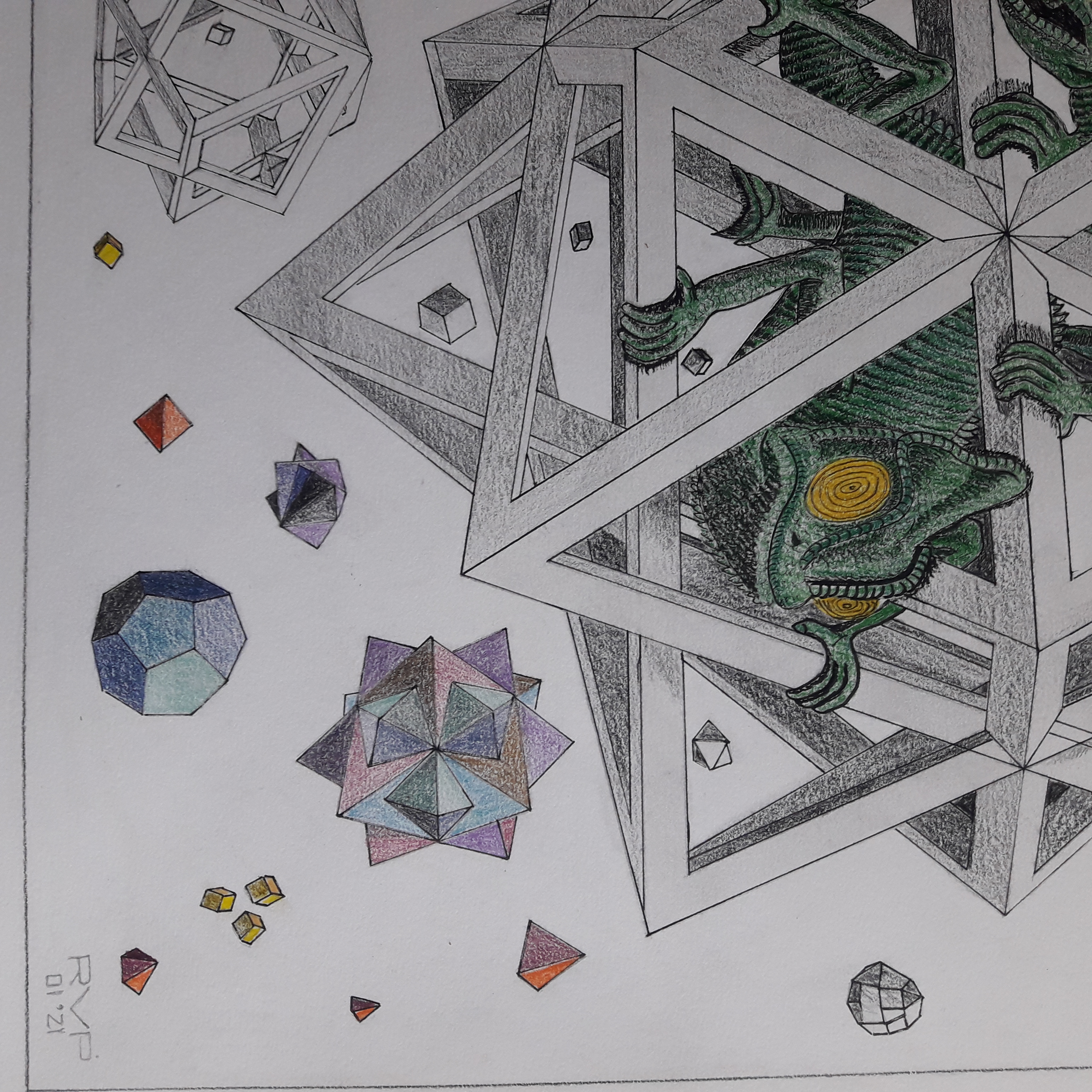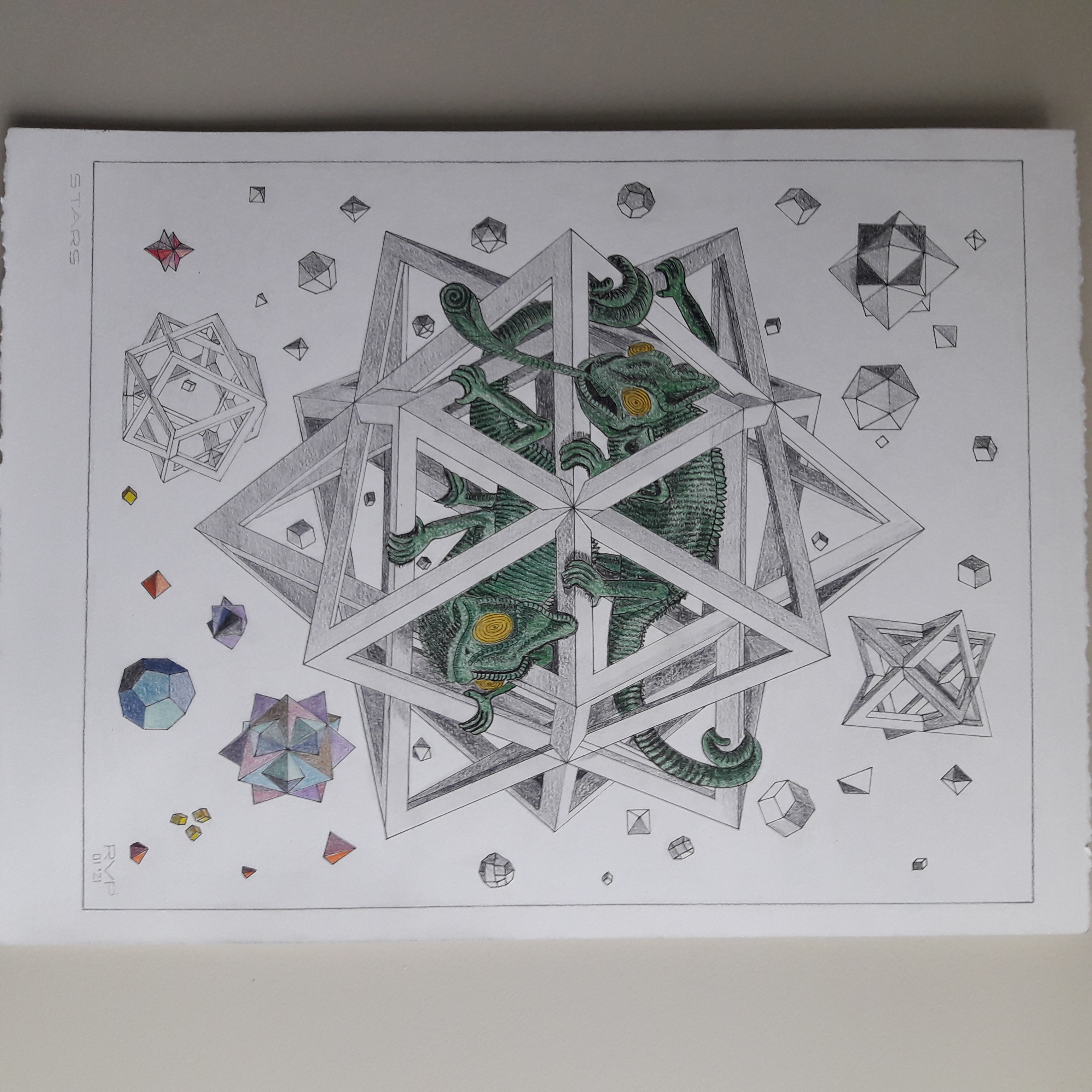 All kinds of single, double, and triple polyhedrons are floating like stars through the air. In the centre is a system of three regular octahedrons, a framework of beams. In this cage live two chameleons whose function is to add an element of life to this dead world. I chose them as inhabitants because their legs and tail are particularly well adapted to grasp the framework of their cage as it whirls through space.