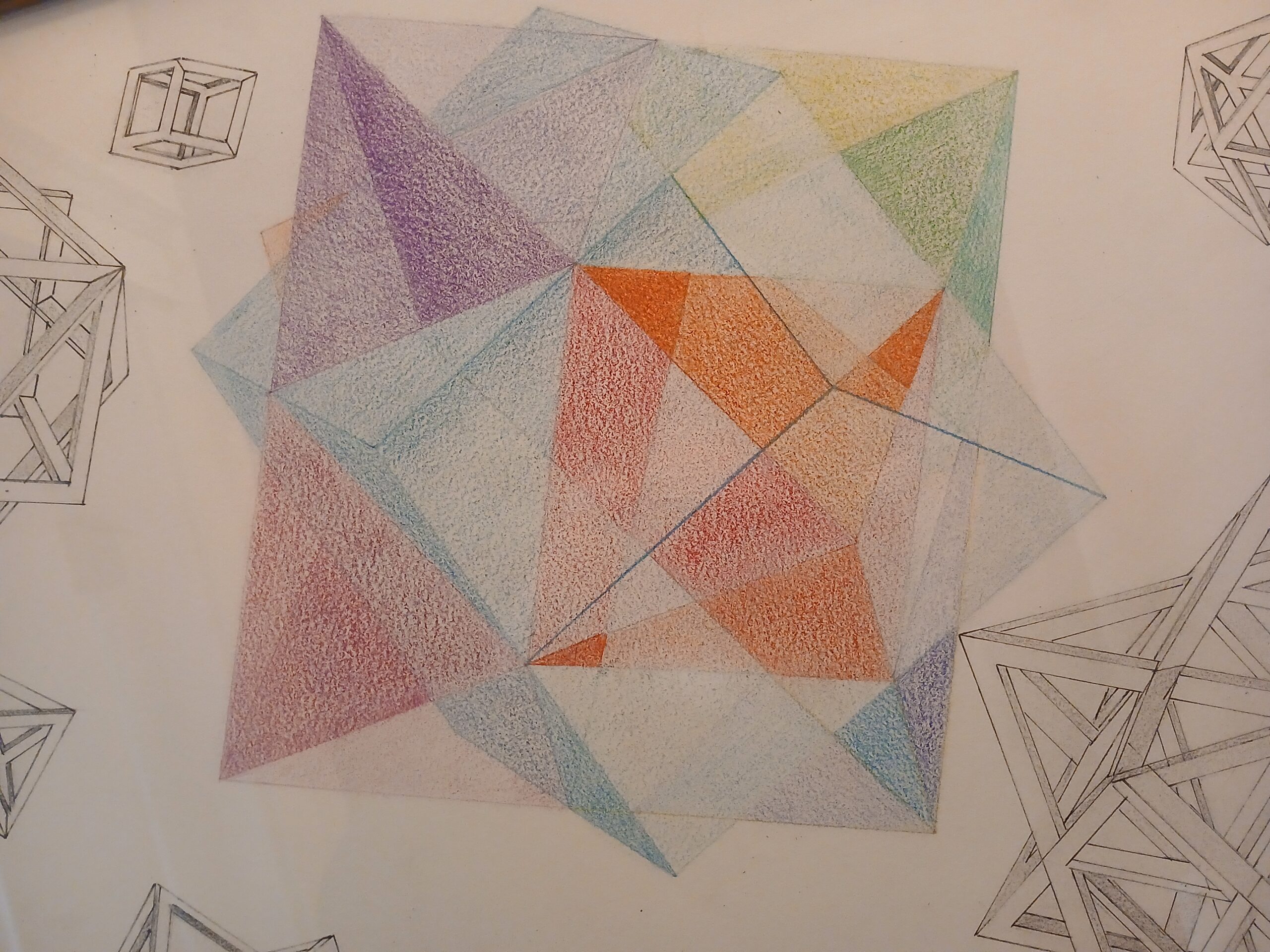 A translucent glass cube with coloured four-sided pyramids on each side. The colours in the pyramids are abstract. It could be redone to realistically intersect the colours of the pyramids seen through the glass.