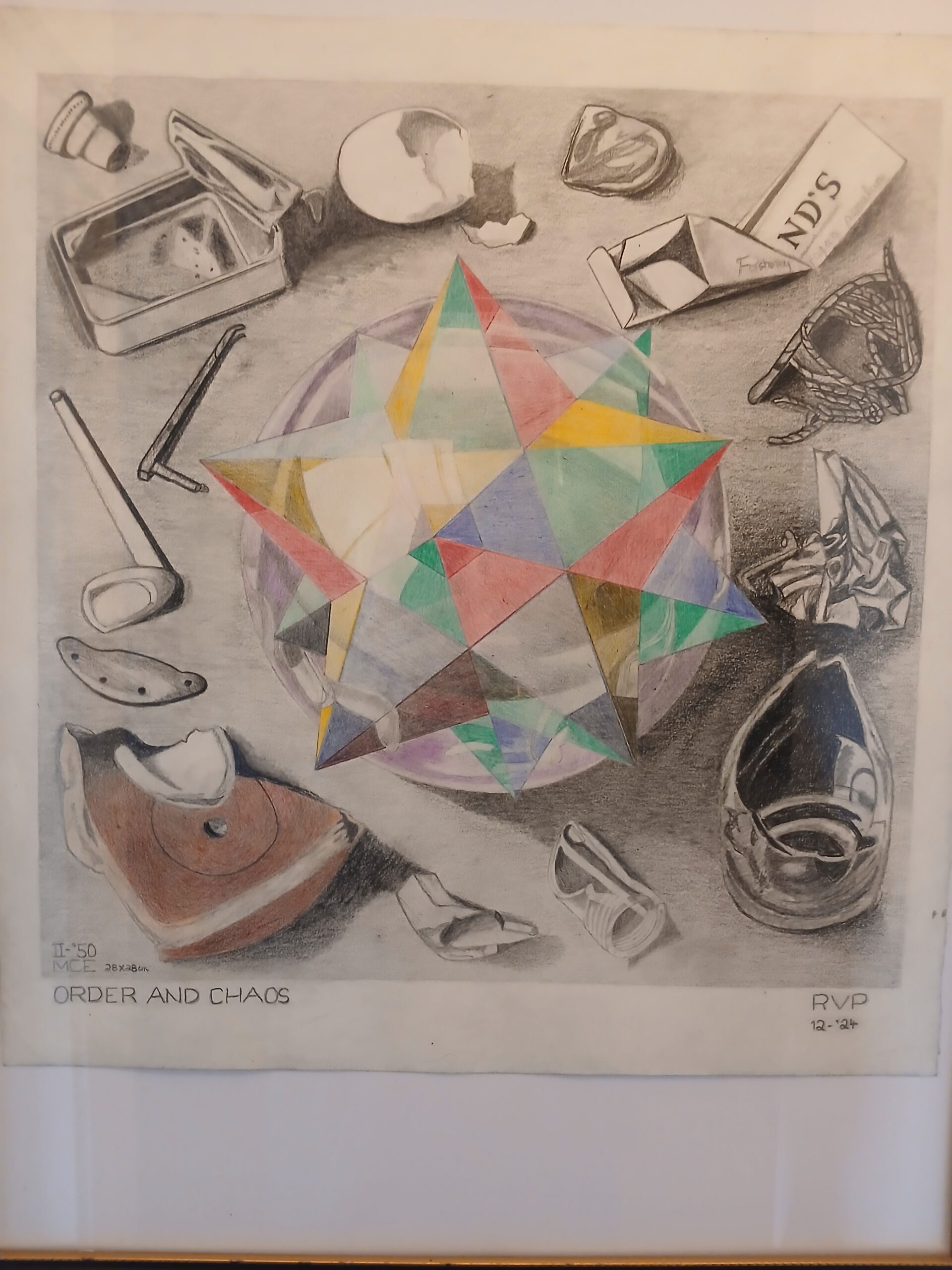 On December 1847, to his friends, Bas and Len Kist: “This new mezzotint which I have just finished will serve as a New Year’s card, and so I am sending you one too. These things always need a name, and I have called it Crystal because “Order and Chaos” sounds too ponderous to Escher, even though that title gave a better indication of his intention. “Chaos is present everywhere in countless ways and forms, while Order remains an unattainable ideal: the magnificent formation of a cube and an octahedron does not exist. Nevertheless, we can continue to hope for it. Is that not a fine wish for the New Year?”