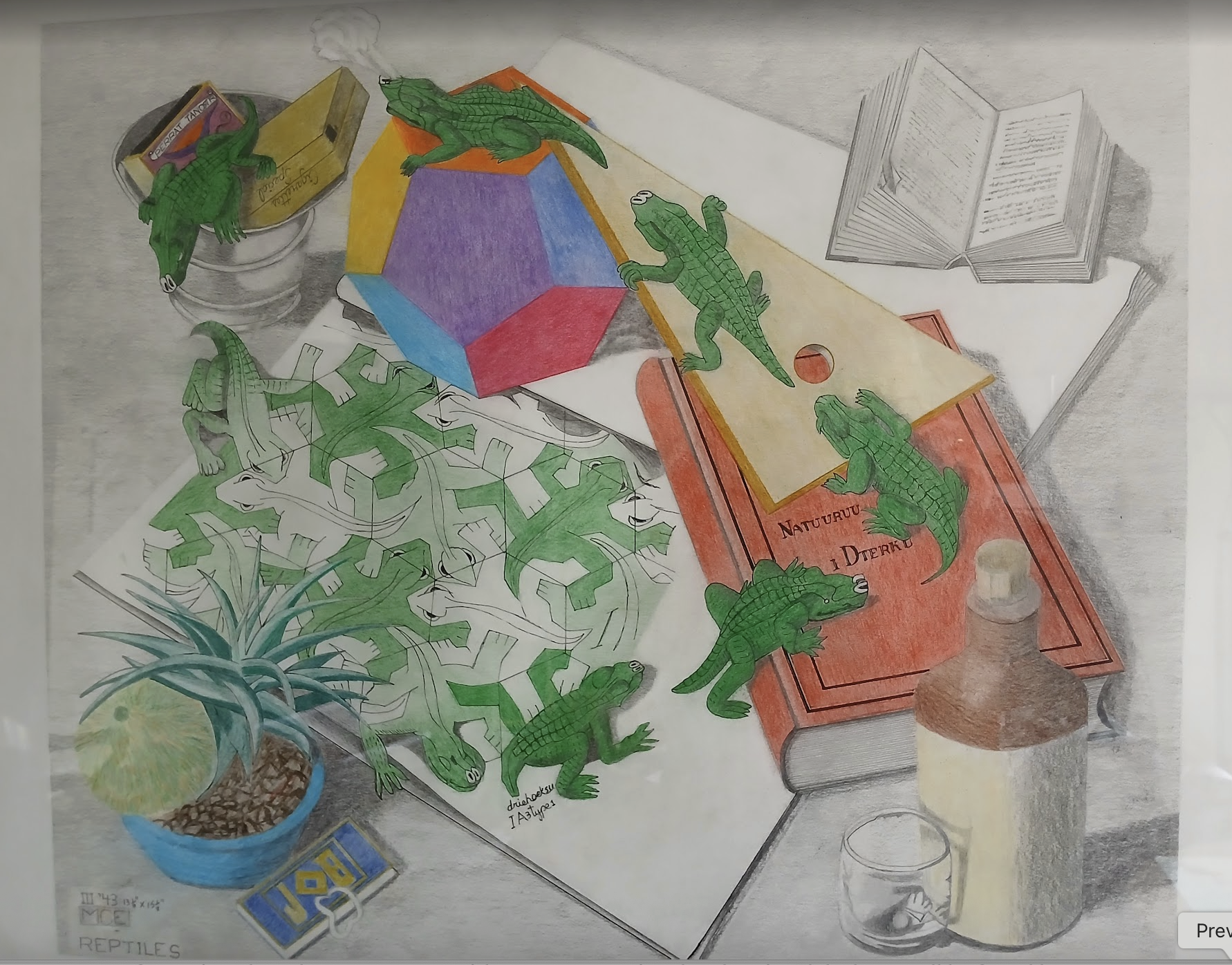 “The Reptiles print itself illustrates one of Escher’s predictions – the bringing to life of an abstract structure. By arranging a few small personal effects around the notebook – a gin glass, an ashtray, and a packet of cigarette papers – Escher suggests the presence of the artist, or rather his temporary absence, during which the drawing in the notebook, his creation, begins to have a life of its own…….