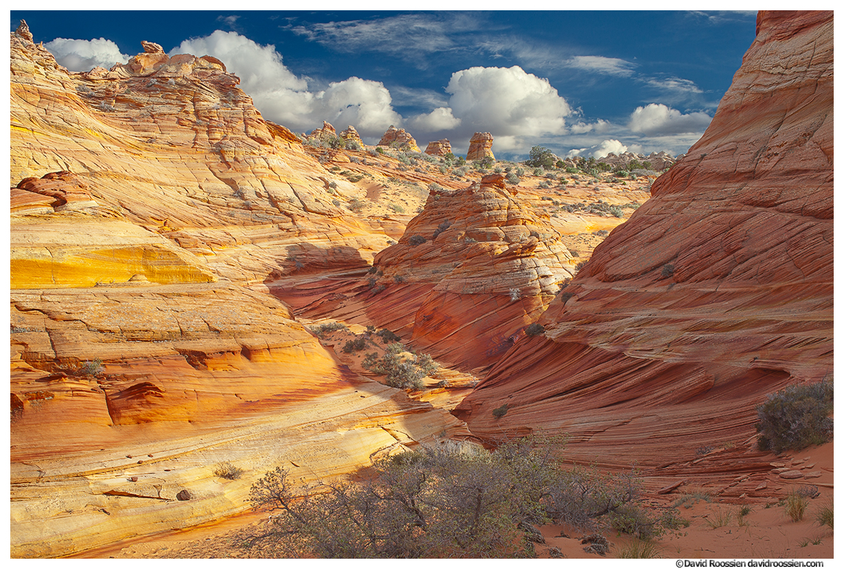 This contains the Wave and other famous sites and extends from Wire Pass about 4 miles south (2 miles in Utah and 2 miles in Arizona), while the southern half stretches a further 4 miles. The only other easily reached starting point for the North is The Notch, 2 miles from Wire Pass, where a trail climbs a pass in the cliffs and leads to the south end of the north section.