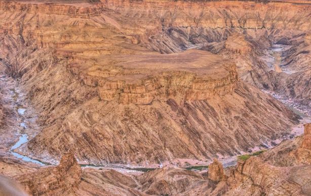 FISH RIVER CANYON. I took Highway C13 north (a gravel superhighway, wide and very smooth) northeast over the broad flat desert to Ai-Ais, a resort with a hot spring on the river at the end of the 5-day hike. I returned the 11km to C13 and continued to Hobas, the entrance to the north end of the canyon. After paying a $80 entrance, I drove the 10 km to the viewpoint above several meanders of the river. Fish River Canyon looks remarkably like the Grand Canyon, just not as deep. The walls are eroded a long way back, there is a broad plateau halfway down (like the Tonto Plateau in the Grand) and the river is often obscured by the steep-walled inner canyon.