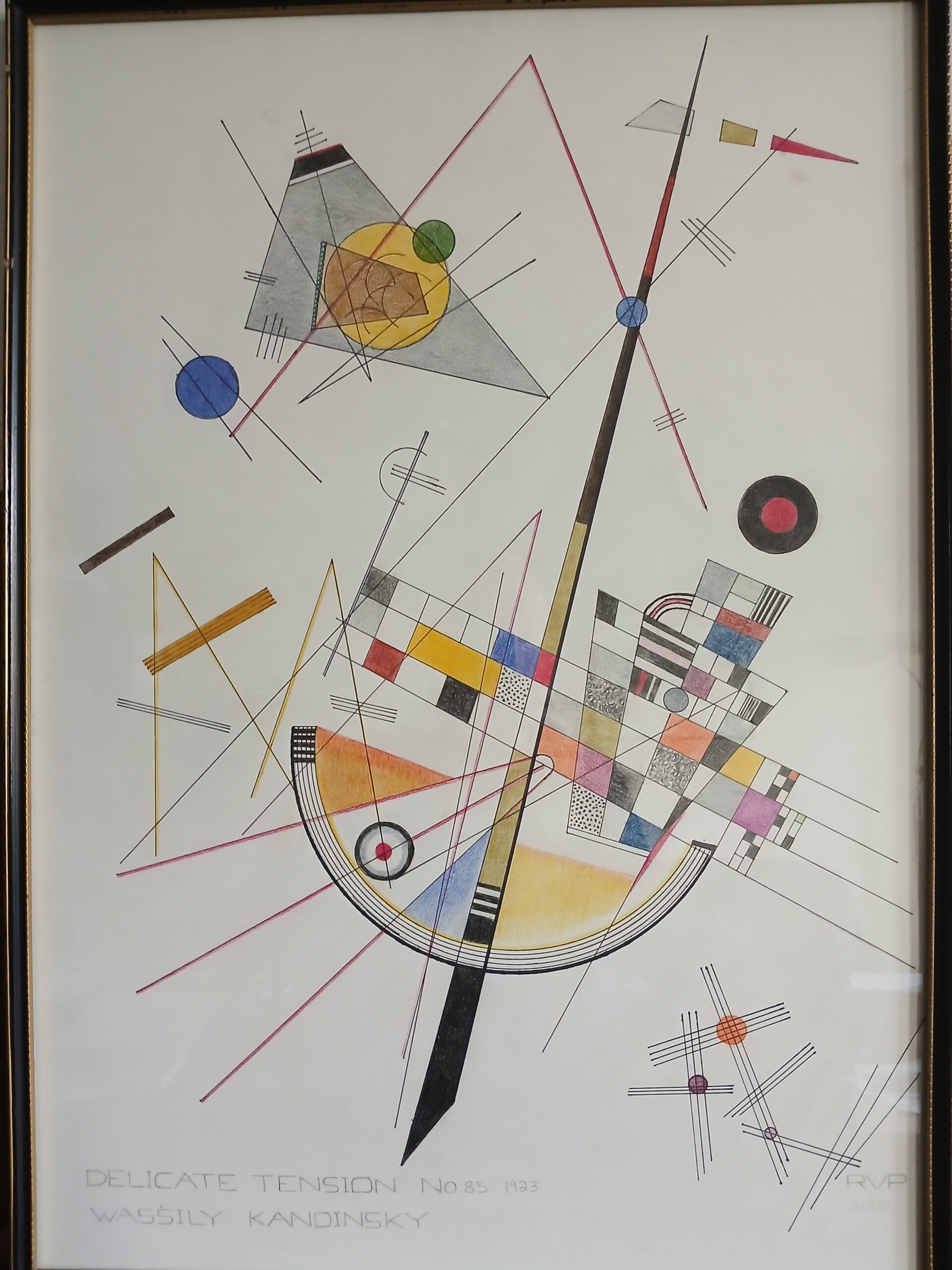 Delicate Tension was executed by Kandinsky at the Bauhaus during the prestigious school’s most rationalist period under the directorship of Theo van Doesburg, from 1923 to 1925. During these years, the initial Expressionistic style of this avant-garde centre evolved towards greater commitment to the Constructivist aesthetic, which was spreading internationally. Kandinsky delved more deeply in his investigation of the correspondences between forms and colours, and the geometric shapes found in his works from this period, which is sometimes described as “cold, ” are basically the circle and the triangle, which he considered to be “the two primary, most strongly contrasting plane figures.”
