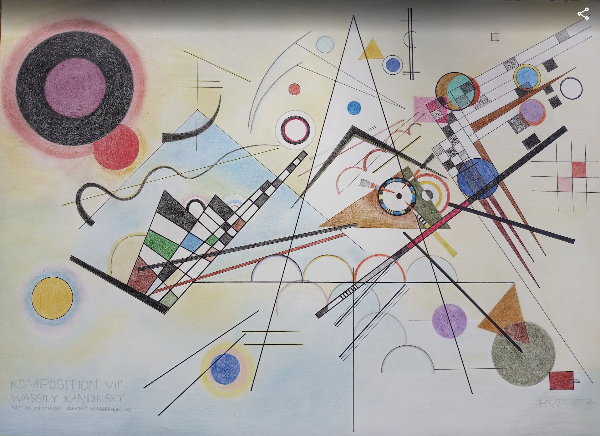 The audience was quite shocked by the transition from the apocalyptic emotion of Composition VII to the geometric rhythm of Composition VIII. “Composition VIII” was painted ten years later, in 1923. It is a logical development of the creative genius of the painter, and to a certain extent, it reflects the influence of Suprematism and Constructivism assimilated by Kandinsky in Russia and in the Bauhaus.