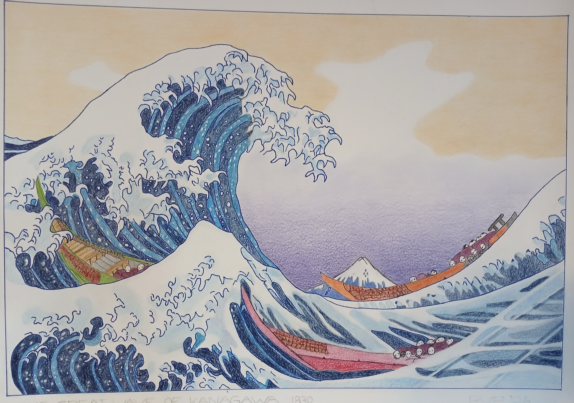 It depicts three fishing boats battling raging seas in Japan’s Chiba Prefecture. It is part of a genre known as “Ukiyo-3” that saw artists mass-produce works on paper using woodblock printing. Likely, several thousand prints were initially produced, but only a fraction are thought to have survived. Printmakers would have produced prints until the woodblocks literally wore out. Possibly 8000 were made. There is photographic evidence of 111 different versions. They were not always as sought-after as they are today.